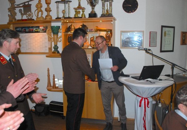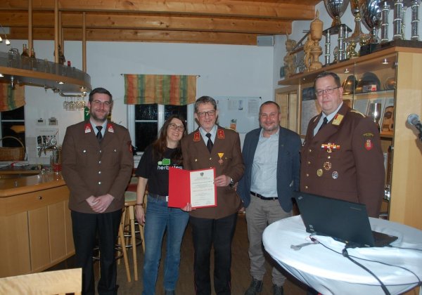Bezirksfeuerwehrkommandant Johannes Enzenhofer überreichte dem scheidenden Kommandanten Klaus Winklhofer das Bundesfeuerwehrverdienstzeichen 3. Stufe für seine geleistete Arbeit.