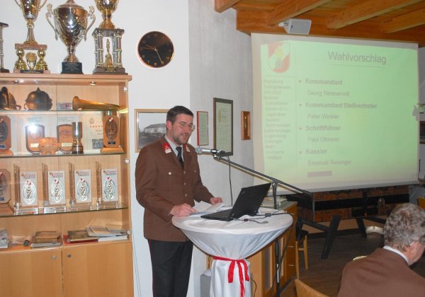 Kommandant Klaus Winklhofer, der 15 Jahre an der Spitze der Wehr stand, legte seine Funktion in die Hände von Georg Nimmervoll, der, wie auch die weiteren Kommandofunktionen, mit 100-prozentiger Zustimmung gewählt wurde.