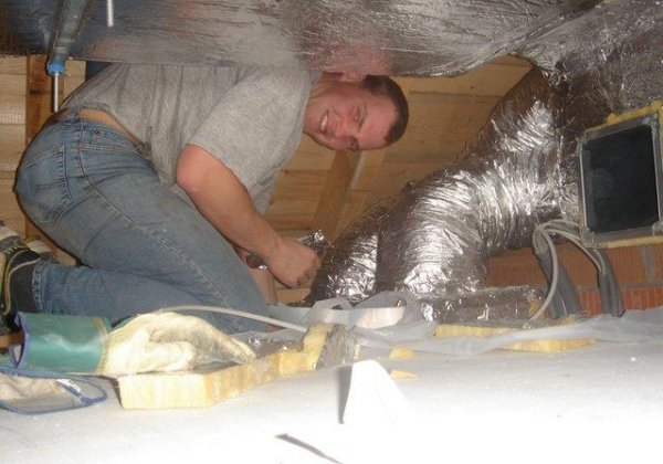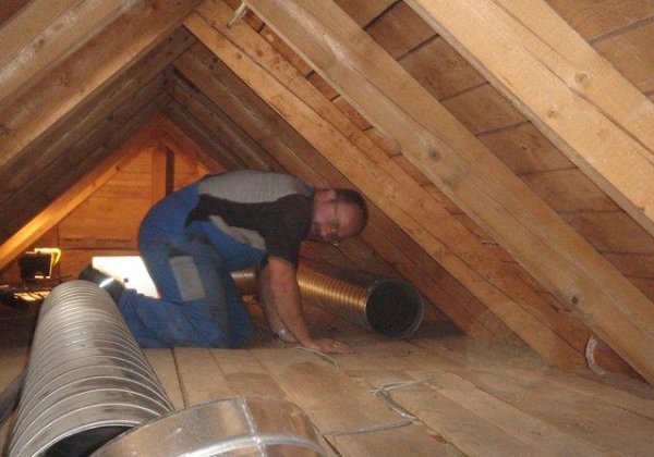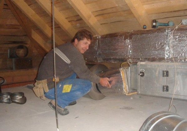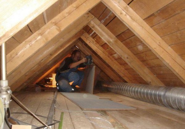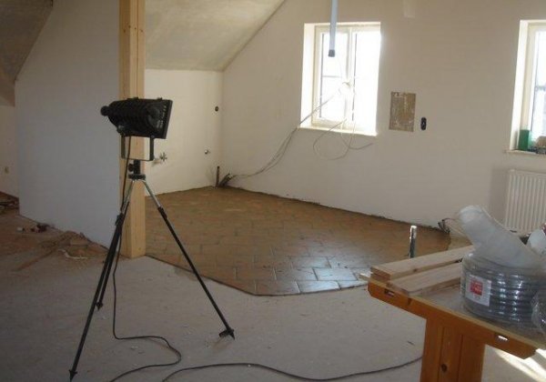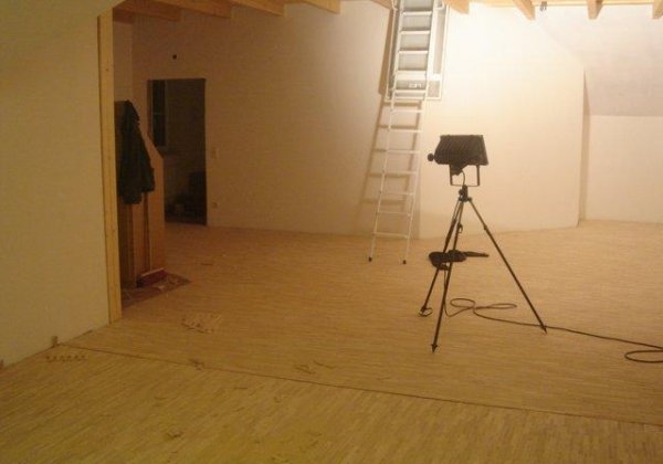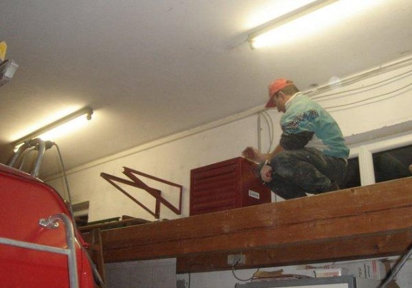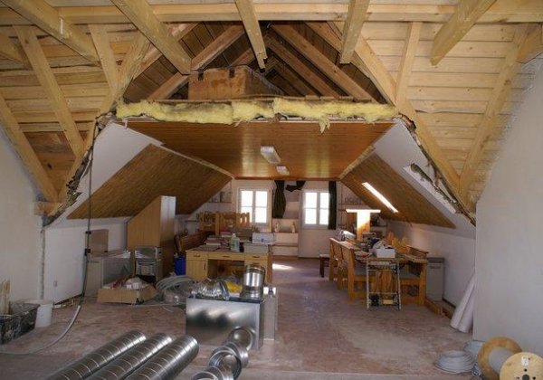 Im Veranstaltungsraum wurde eine Holzdecke angebracht, anschließend erfolgten die Isolierarbeiten. Nebenbei wurden Teile für Raumlüftung installiert.