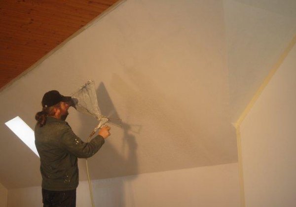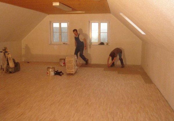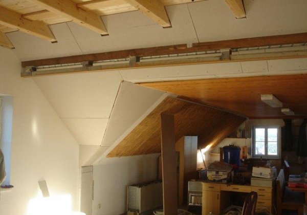 Auch die Dachschrägen wurden isoliert und mit Rigipsplatten verkleidet. Im Moment sind die Spachtler am Zug.