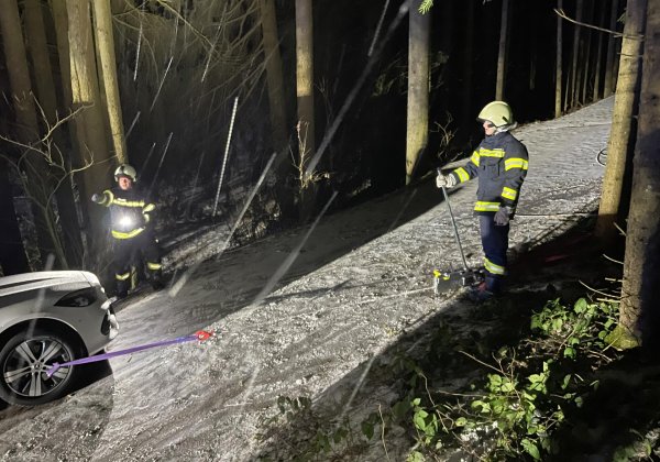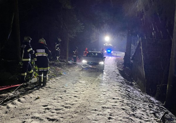 Nach Absicherung der Unfallstelle konnte das Fahrzeug mittels Greif- und Kettenratschenzug kontrolliert und sicher zurück auf die befestigte und griffige Straße gezogen werden.